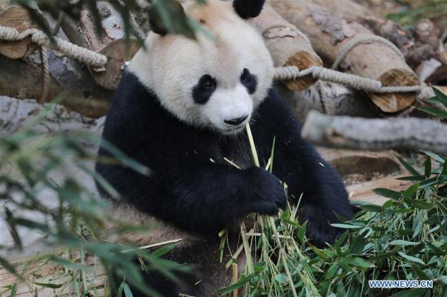 Giant panda "Xingbao" eats in its enclosure in Qianlingshan Park in Guiyang, capital of southwest China's Guizhou Province, April 22, 2018. [Photo: Xinhua/Ou Dongqu]