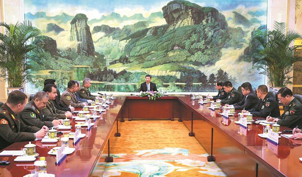 President Xi Jinping, who is also chairman of the Central Military Commission, meets with all Shanghai Cooperation Organization defense ministers in Beijing at the Great Hall of the People on Monday. FENG YONGBIN / CHINA DAILY