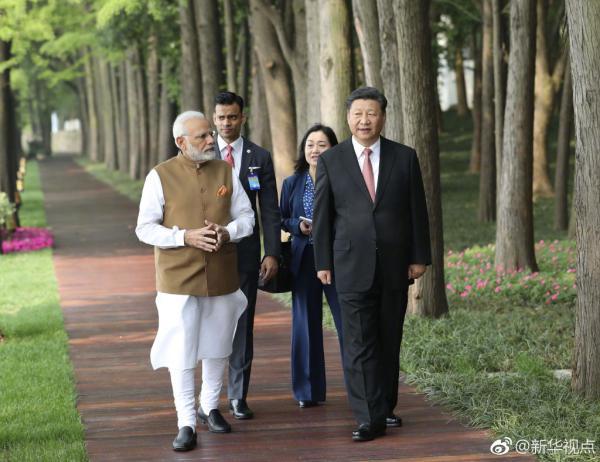 Chinese President Xi Jinping and Indian Prime Minister Narendra Modi exchanged views on bilateral relations, and international and regional issues of common concern Saturday morning, as they walked on the shores of Wuhan's East Lake in central China.