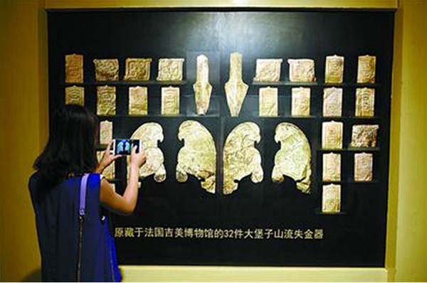 A visitor takes photo of the gold ornaments French collectors handed over to China, July 20, 2015. [Photo/Xinhua]