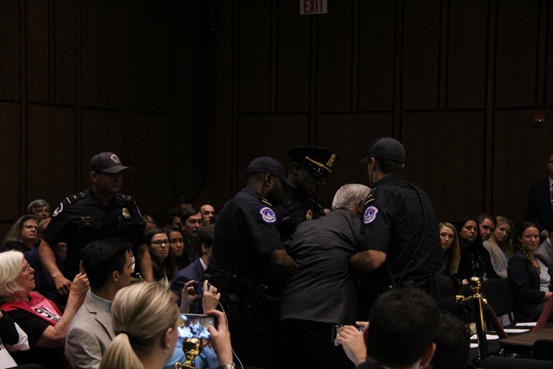 A demonstrator is led out of the Gina Haspel hearing on May 9, 2018. (Photo: He Zexi)