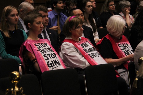 Demontrators met inside the Senate Committee hearing in opposition to Gina Haspel's nomination as CIA-Director on May 9, 2018. (Photo: He Zexi)