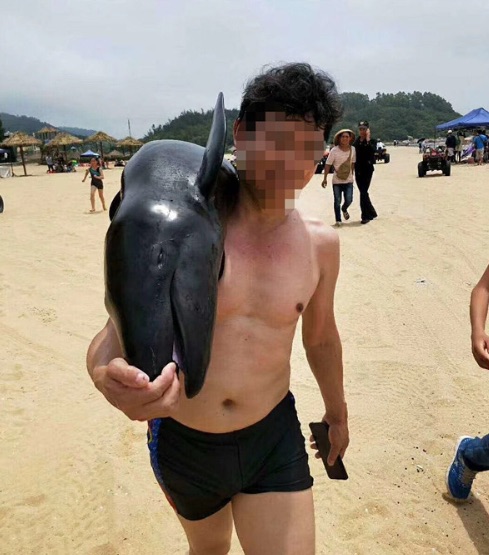 A video clip went viral on Chinese social media depicting a male tourist taking what appeared to be a dying dolphin-like mammal from Wanda beach during the Labor Day holiday.