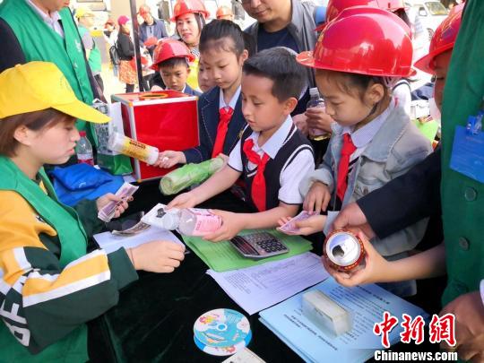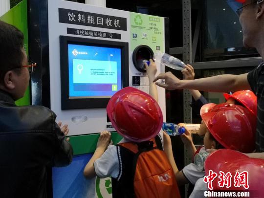 Visiting students putting a plastic bottle in the recycling machine. (Chinanews.com)
