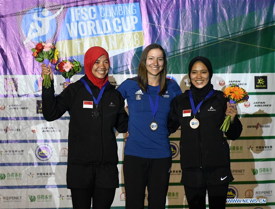 Champion Anouck Jaubert (C) of France, second place winner Sari Agustina (L) of Indonesia and third place winner Aries Susanti Rahayu of Indonesia pose on the podium after the women's speed match of IFSC Climbing World Cup in Tai'an, east China's Shandong Province, May 13, 2018. (Xinhua/Zhu Zheng)