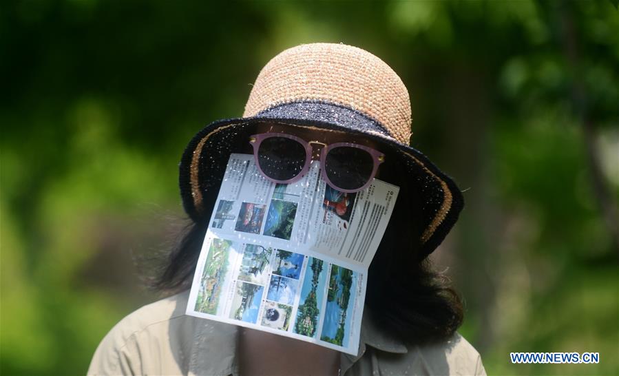 A woman wearing hat and sunglasses is seen on a street in Yangzhou, east China's Jiangsu Province, May 16, 2018. Heat wave hit Jiangsu Wednesday with temperatures over 35 degrees Celsius in some places. (Xinhua/Meng Delong)