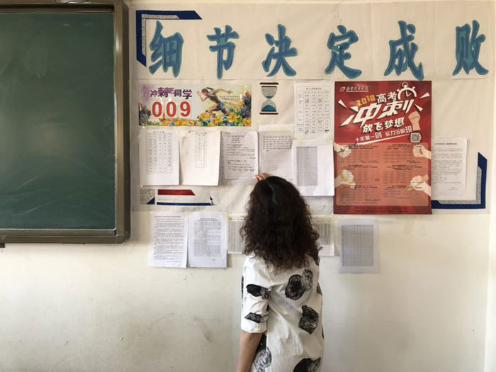 Pan Wenzhen, a teacher from the Xinjiang branch of Huanggang Middle School, posts inspiring slogans and teaching materials on the wall. (Photo provided by Pan Wenzhen/Huanggang Middle School)