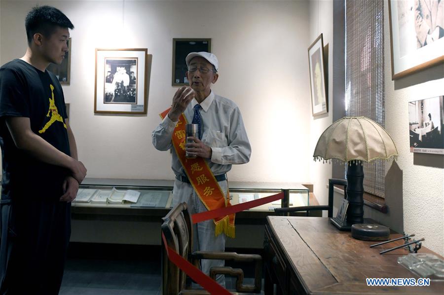 Shan Zhixian (R), 77, volunteer as an interpreter at Lao She memorial house in Qingdao, east China's Shandong Province, June 1, 2018. The 18th Shanghai Cooperation Organization (SCO) Summit is scheduled for June 9-10 in Qingdao. Volunteers are easily seen on the street. (Xinhua/Zhu Zheng)