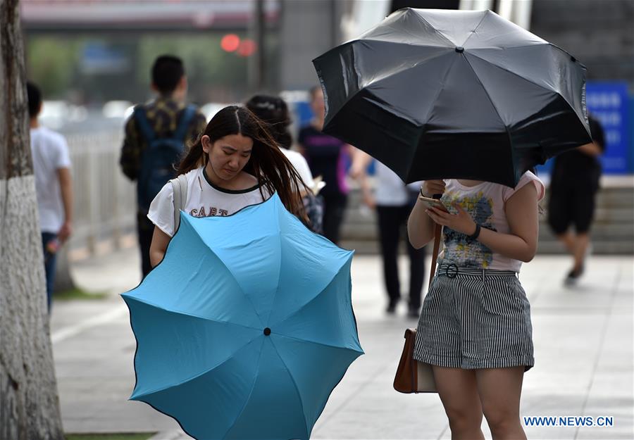 People use umbrellas to prevent direct sunshine in Tianjin, north China, June 5, 2018. The temperature here broke through 40 degrees celsius on Tuesday. (Xinhua/Li Ran)
