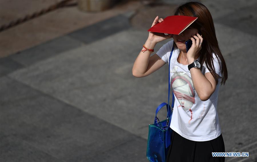 A woman walks under the scorching sun in Tianjin, north China, June 5, 2018. The temperature here broke through 40 degrees celsius on Tuesday. (Xinhua/Li Ran)