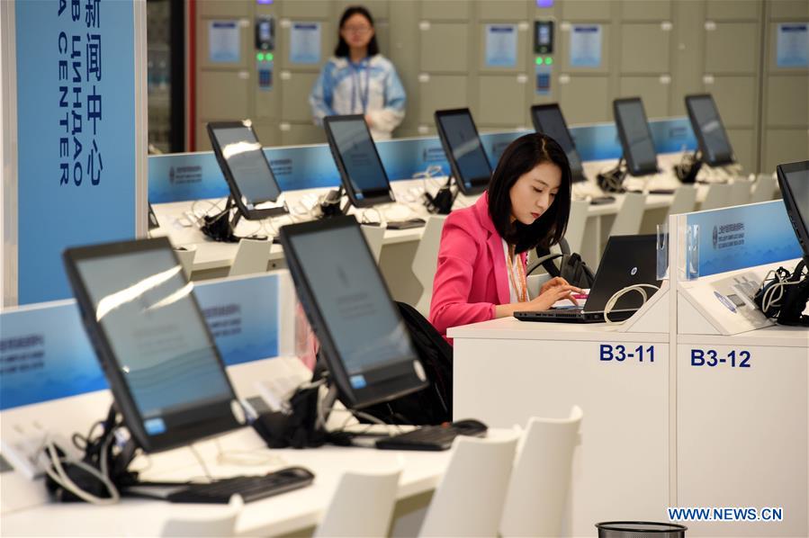A journalist works at the Media Center of the Shanghai Cooperation Organization (SCO) Qingdao Summit in Qingdao, east China's Shandong Province, June 6, 2018. The media center of the summit will open to journalists from home and abroad from June 6 to 11. (Xinhua/Li Ziheng)