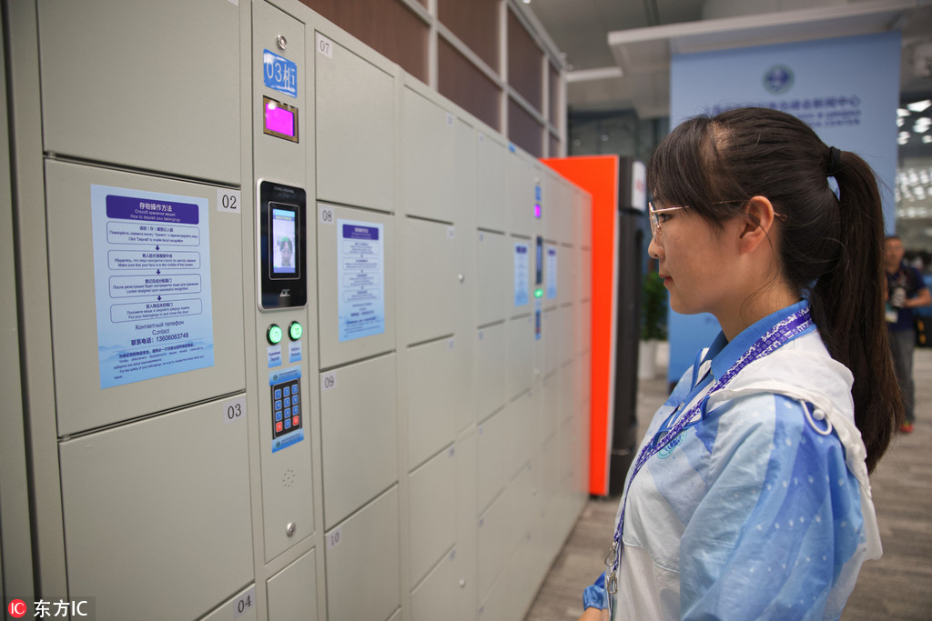 A volunteer demonstrates opening an intelligent locker by facial recognition at the media center for 18th SCO Summit in Qingdao city, East China's Shandong province, June 6, 2018. [Photo/IC]