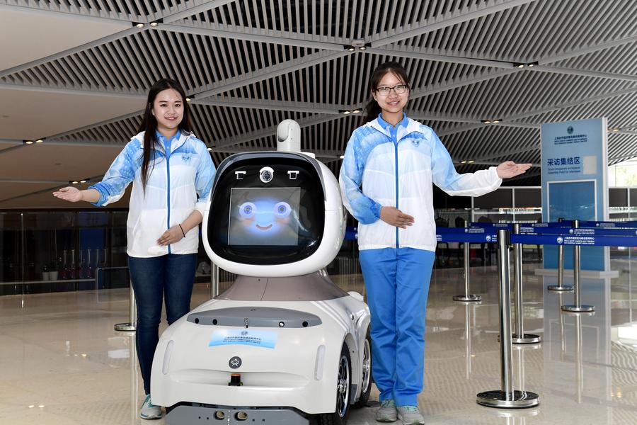 Two volunteers pose for a picture with Hai Hai, a security robot that will patrol the media center of the SCO Summit 24 hours a day. [Photo/Xinhua]