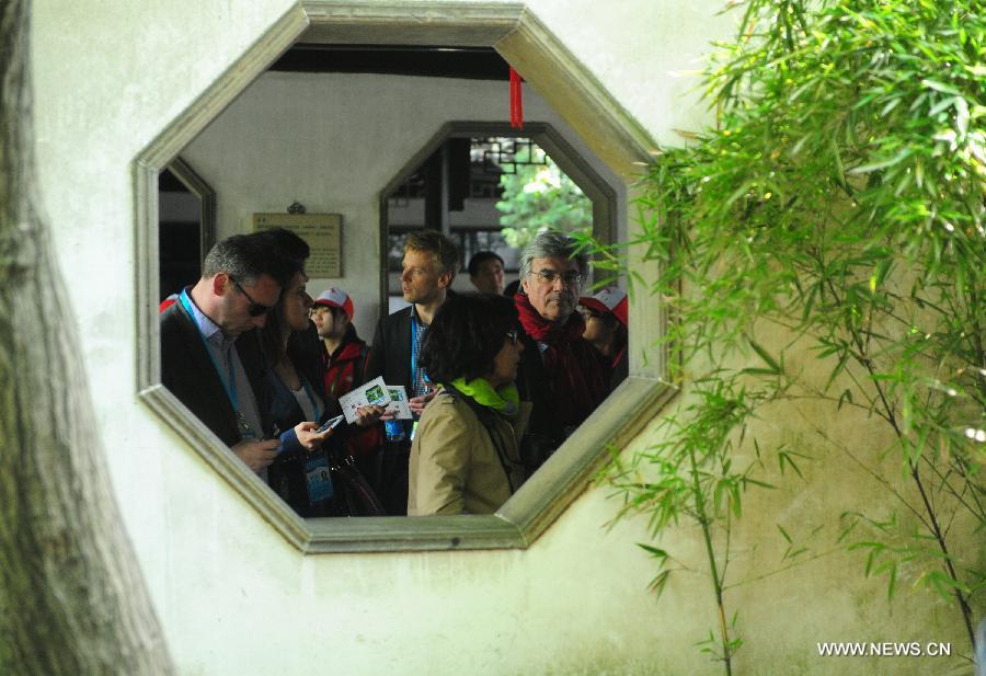 European representatives attending the fourth China-Europe High-Level Political Party Forum visit Liuyuan or Lingering Garden in Suzhou, east China's Jiangsu Province, April 22, 2013. (Xinhua/Shen Peng)