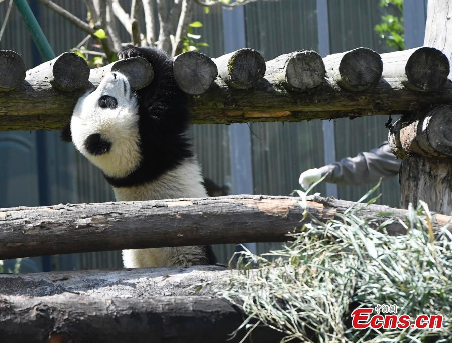 Photo taken on June 10, 2018 shows a giant panda born this year at the China Conservation and Research Center for the Giant Panda plays on a sunny day. (Photo: China News Service/An Yuan)