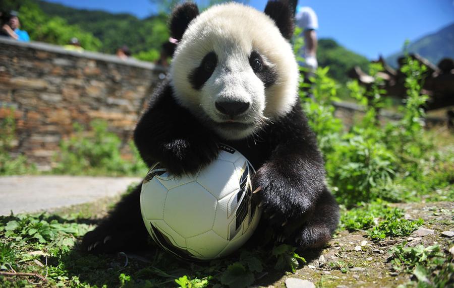 Pandas show off their soccer skills at the China Conservation and Research Center for Giant Panda in Southwest China's Sichuan Province on June 10 ahead of the FIFA World Cup. (Photo/Courtesy of the China Conservation and Research Center for Giant Panda)