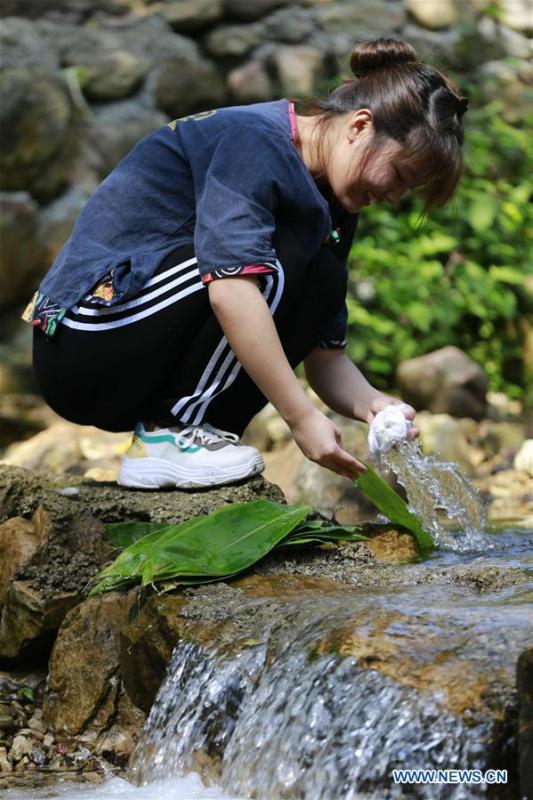 A woman cleans leaves for making Zongzi, a pyramid-shaped dumpling made of glutinous rice wrapped in bamboo or reed leaves, to greet the upcoming Dragon Boat Festival in a rivulet of Zhangjiajie City, central China's Hunan Province, June 11, 2018. (Xinhua/Wu Yongbing)