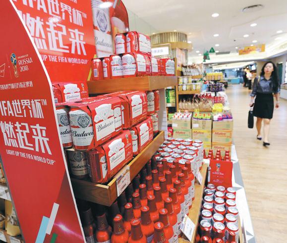 Beer is sold at a 2018 World Cup-themed promotion event at a supermarket in Nanjing, Jiangsu province, on June 7. [Photo by Yu Tian/For China Daily]