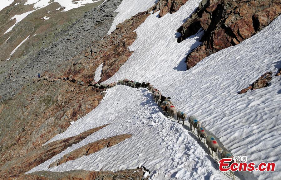 Sheep cross the alpine pass "Hochjoch" at 2,856 meters above sea level, in the autonomous region of South Tyrol, Italy, June 9, 2018. (Photo/Agencies)