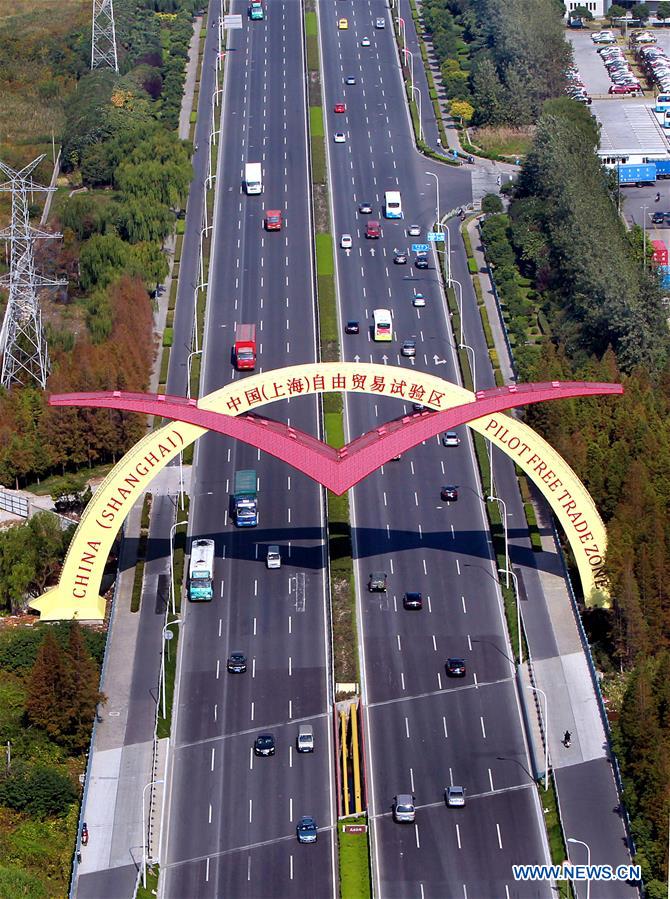 Aerial photo taken on Oct. 29, 2013 shows a road to the Shanghai free trade zone (FTZ) in Pudong of Shanghai, east China. China announced the opening-up and development of Pudong in 1990. Pudong is expecting to take the opportunity of celebrating the 40th anniversary of China's reform and opening-up to continue to spearhead the country's reform and development. (Xinhua/Fan Jun)