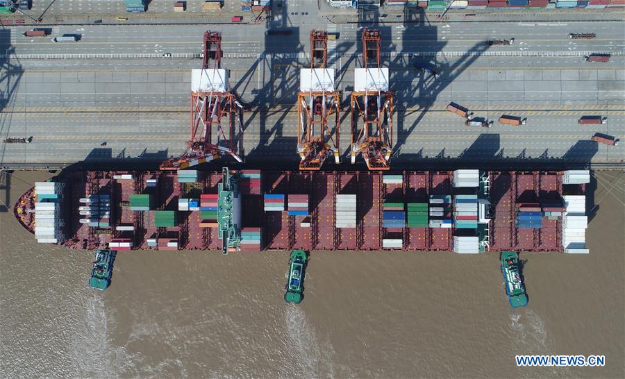 Aerial photo taken on April 23, 2017 shows a container dock of Yangshan Port in Pudong of Shanghai, east China. China announced the opening-up and development of Pudong in 1990. Pudong is expecting to take the opportunity of celebrating the 40th anniversary of China's reform and opening-up to continue to spearhead the country's reform and development. (Xinhua/Ding Ting)