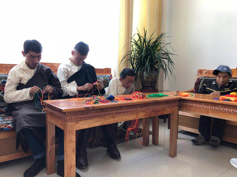People with disabilities weave Tibetan knot at a welfare center in Lhasa, Tibet autonomous region, June 20, 2018. By making some handicrafts, these people can earn money to support their families. [Photo provided to chinadaily.com.cn]