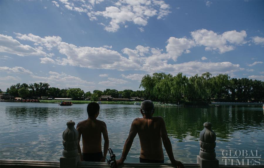 Two men prepare for a swim as temperatures hit 34 degrees in Beijing on Thursday. (Photo: Li Hao/GT)