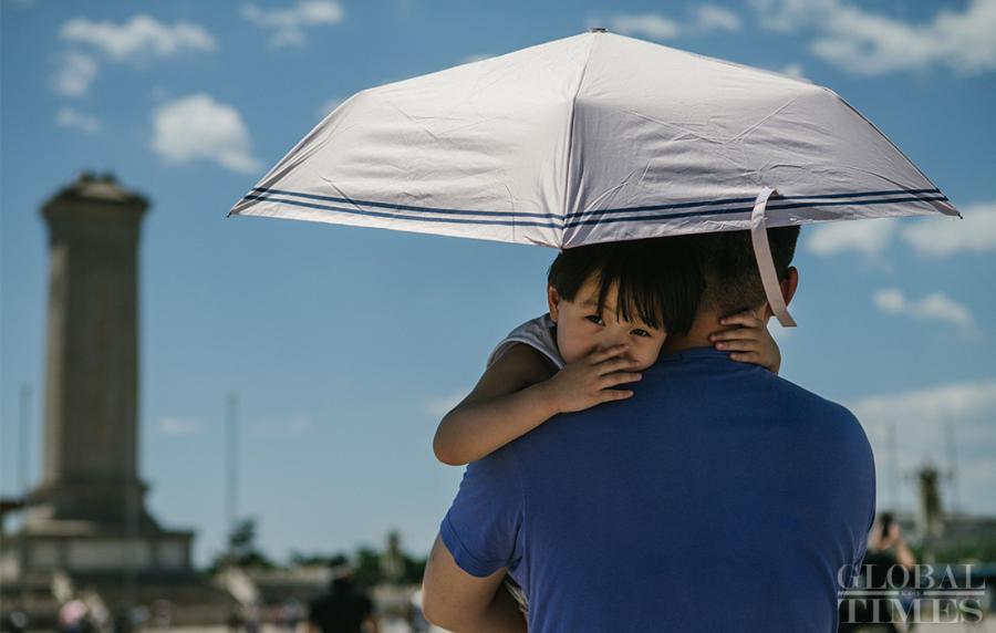 A father holds his son under an umbrella in Beijing on Thursday. (Photo: Li Hao/GT)