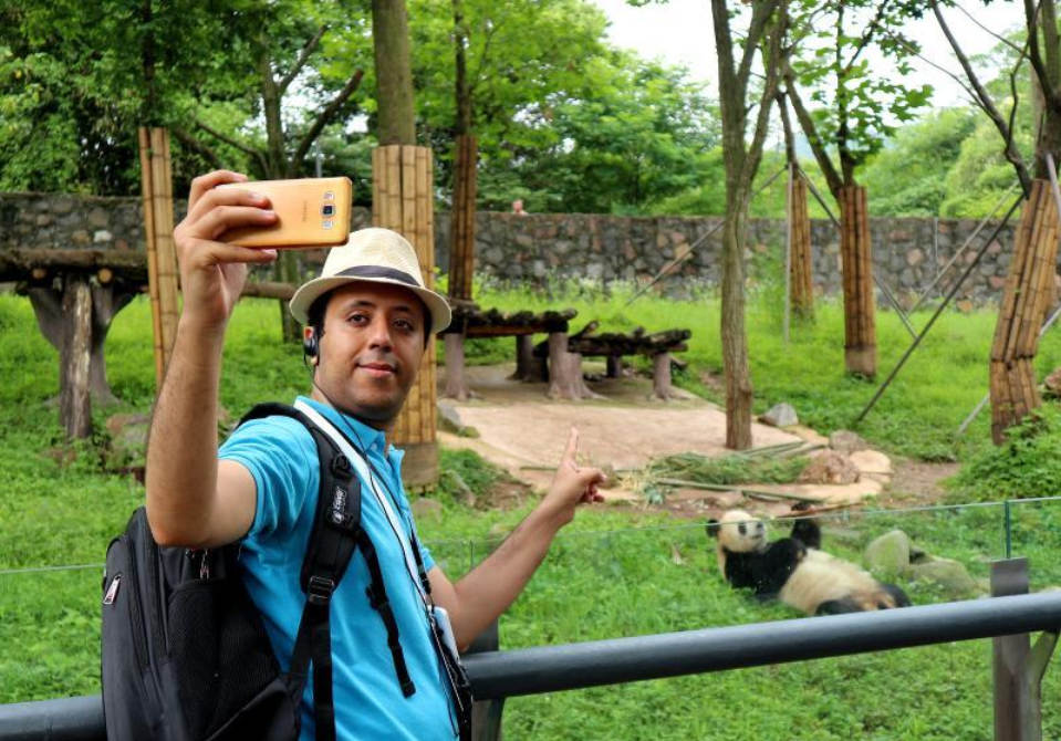A delegate from Algeria snaps a selfie with a panda at the Dujiangyan Base of the China Conservation and Research Center for the Giant Panda on June 25, 2018. (Photo/China.org.cn)