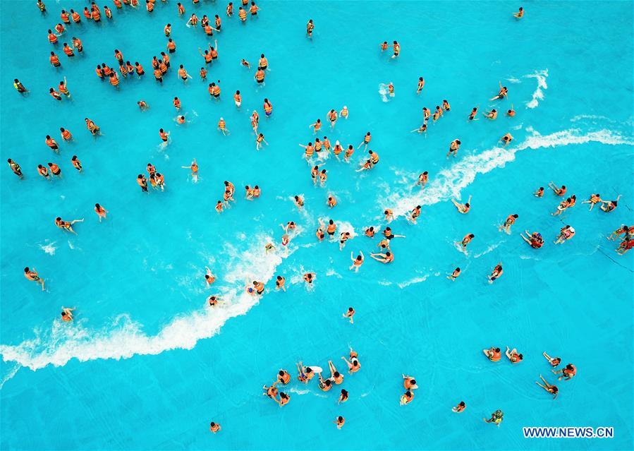 People cool off at a waterpark in Haizhou District of Lianyungang, east China's Jiangsu Province, July 2, 2018. (Xinhua/Geng Yuhe)