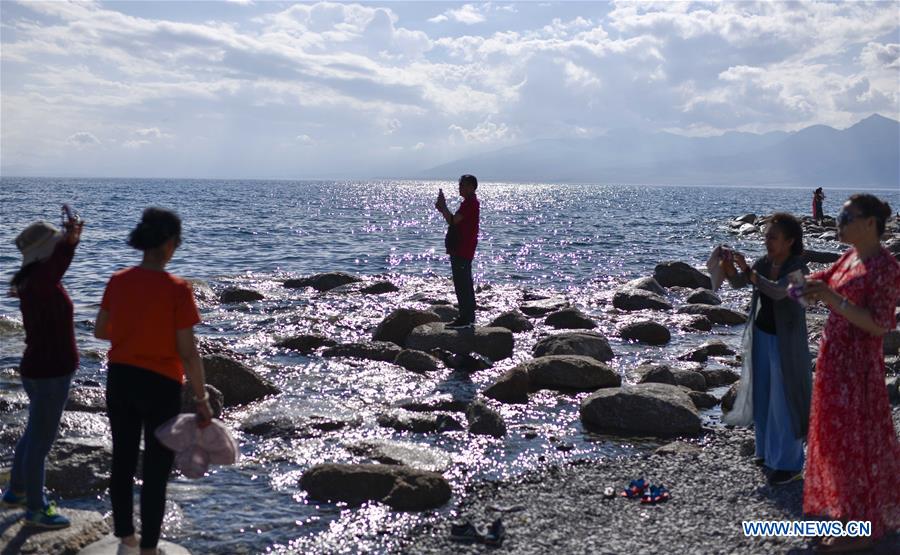Tourists visit the Sayram Lake in Bole City, northwest China's Xinjiang Uygur Autonomous Region, July 5, 2018. (Xinhua/Zhao Ge)