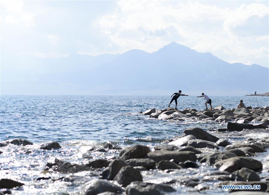 Tourists visit the Sayram Lake in Bole City, northwest China's Xinjiang Uygur Autonomous Region, July 5, 2018. (Xinhua/Zhao Ge)