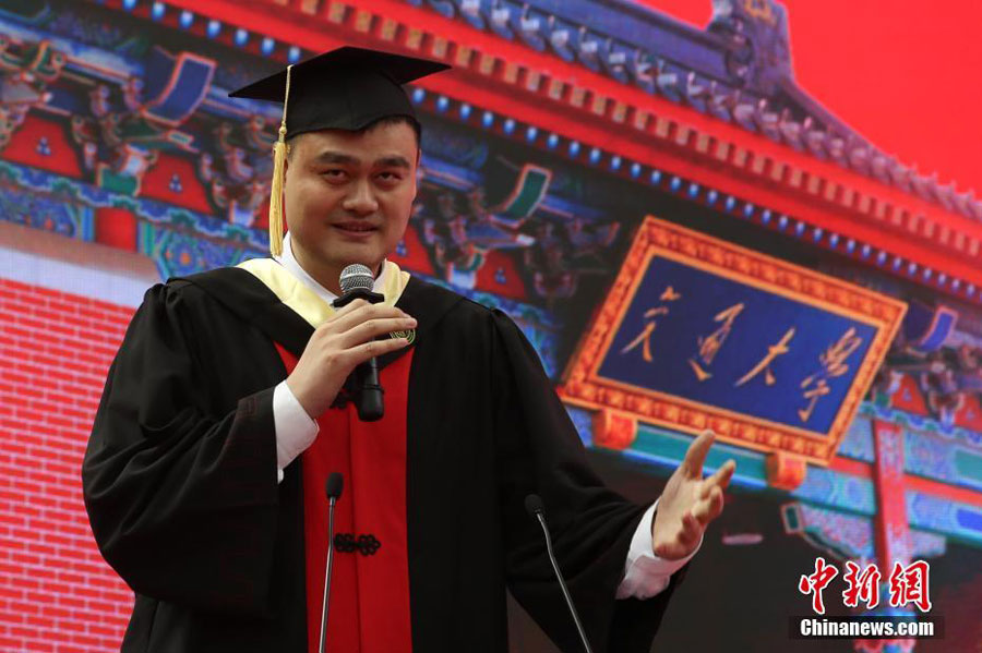 Yao Ming gives his best wishes to the new graduates. (Zhang Hengwei/Chinanews.com)