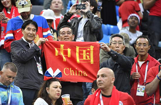Chinese soccer fans display their loyalty during the match between Russia and Egypt in St. Pertersburg, Russia, on June 19. [Photo/Xinhua]