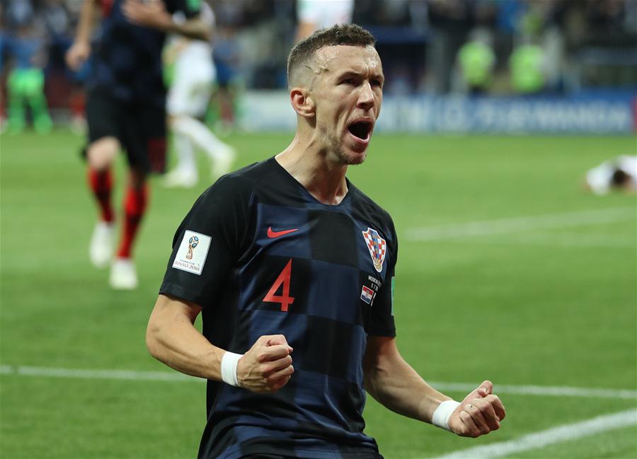 Goalkeeper Jordan Pickford (C) of England vies with Ante Rebic (L) of Croatia during the 2018 FIFA World Cup semi-final match between England and Croatia in Moscow, Russia, July 11, 2018. (Xinhua/Cao Can)