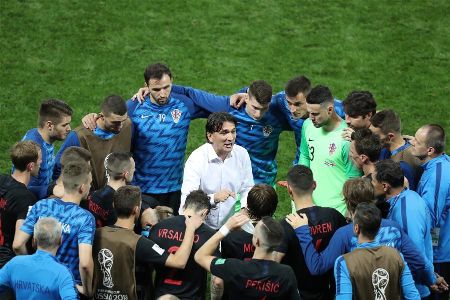 Zlatko Dalic (C) of Croatia gives instructions to players prior to the extra time of the 2018 FIFA World Cup semi-final match between England and Croatia in Moscow, Russia, July 11, 2018. (Xinhua/Bai Xueqi)