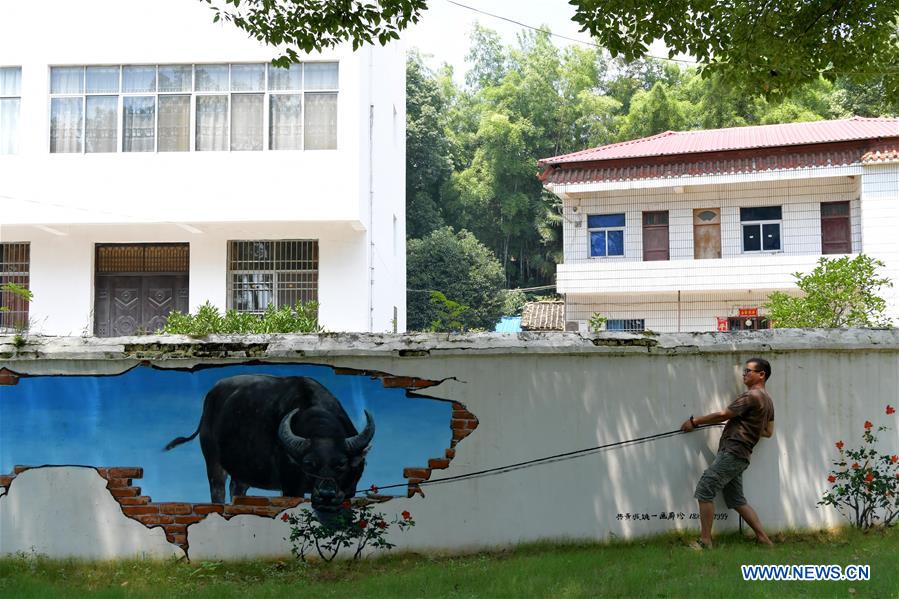 Painter Li Jun poses with his 3D wall picture in Shuangtang Village of Gongqingcheng City, east China's Jiangxi Province, July 10, 2018. Local government has made efforts in recent years to overhaul the living environment of villages. (Xinhua/Peng Zhaozhi)