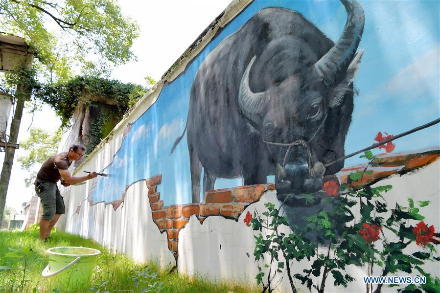 Painter Li Jun colors his 3D wall picture in Shuangtang Village of Gongqingcheng City, east China's Jiangxi Province, July 10, 2018. Local government has made efforts in recent years to overhaul the living environment of villages. (Xinhua/Peng Zhaozhi)