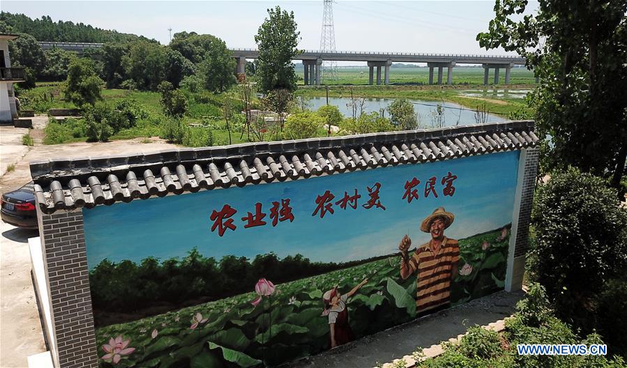 Aerial photo taken on July 10, 2018 shows the wall picture in Datang Village of Gongqingcheng City, east China's Jiangxi Province. Local government has made efforts in recent years to overhaul the living environment of villages. (Xinhua/Peng Zhaozhi)