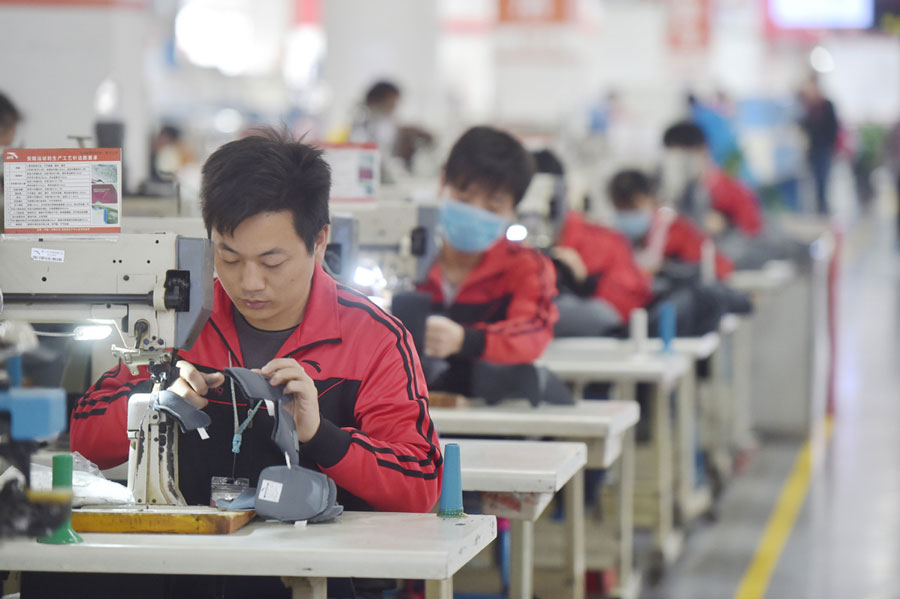Workers at Anta Sports in Jinjiang, Fujian province, on Feb 24, 2018. [Photo/Xinhua]