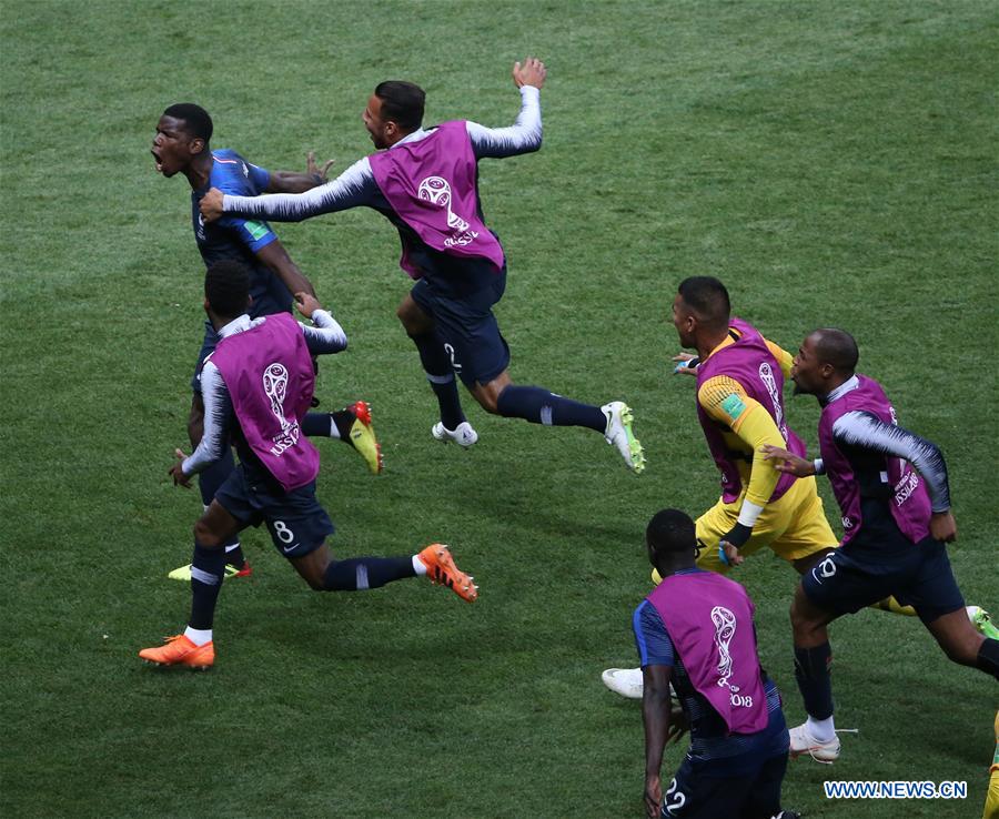 Paul Pogba (1st L) of France celebrates scoring during the 2018 FIFA World Cup final match between France and Croatia in Moscow, Russia, July 15, 2018. (Xinhua/Li Ming)