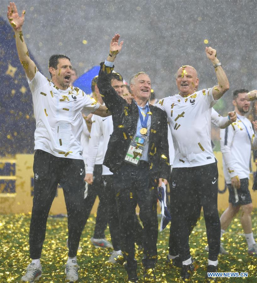 Head coach Didier Deschamps (C front) of France celebrates at the awarding ceremony after the 2018 FIFA World Cup final match between France and Croatia in Moscow, Russia, July 15, 2018. France defeated Croatia 4-2 and claimed the title. (Xinhua/Li Ga)