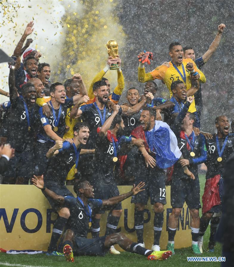 Players of France celebrate at the awarding ceremony after the 2018 FIFA World Cup final match between France and Croatia in Moscow, Russia, July 15, 2018. France defeated Croatia 4-2 and claimed the title. (Xinhua/Li Ga)