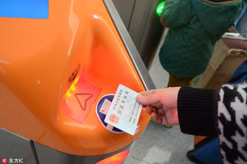 A passenger swipes an ID card on a self-service machine to take the train at Chengdu East Railway Station, Jan 20, 2015. [Photo/IC]