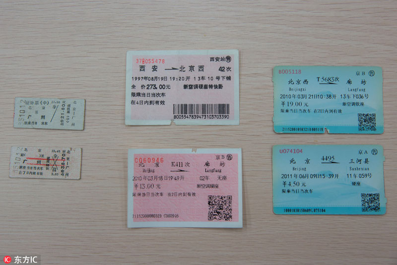 The first to third generation of paper tickets for Chinese trains are seen, from left to right. [Photo/IC]