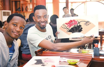A student in the Confucius Insitute in the University of Zambia shows his painting.