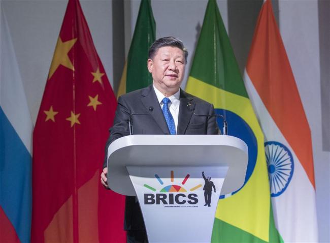 When addressing the BRICS Business Forum at the 10th BRICS summit in Johannesburg, South Africa, Xi lauded the outstanding contribution BRICS countries -- Brazil, Russia, India, China and South Africa -- have made to global economic recovery and growth in their first decade of cooperation.