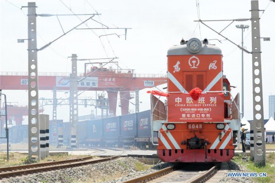 A freight train loaded with imported vehicles arrives at the container terminal in Xi'an of northwest China's Shaanxi Province, June 13, 2018.