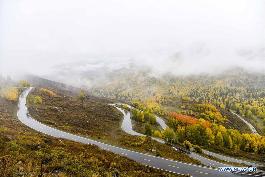 Photo taken on Sept. 23, 2017 shows a car on its way to the Hemu scenic area of Kanas in northwest China's Xinjiang Uygur Autonomous Region.