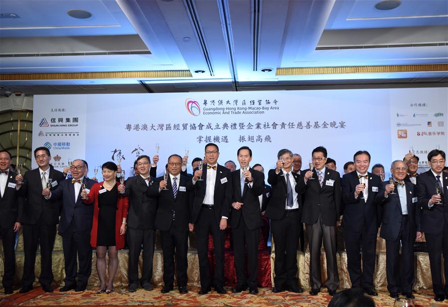 Photo taken on Oct. 26, 2017 shows guests toasting for the establishment of Guangdong-Hong Kong-Macao-Bay Area Economic and Trade Association in Hong Kong, south China. (Xinhua/Wang Shen)